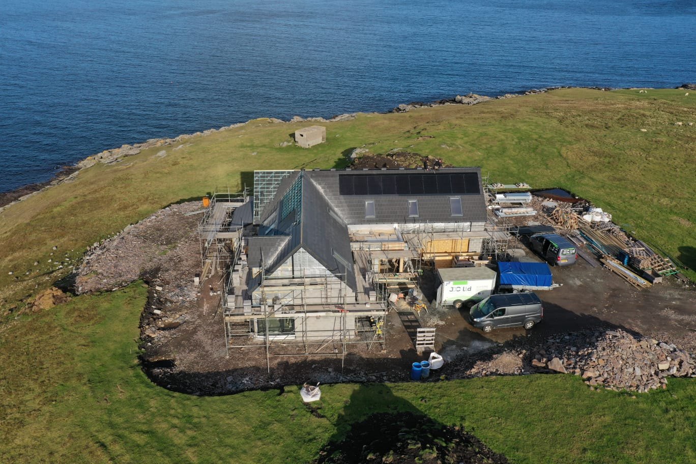 This attractive larch-clad extension in Burra provided the client with a new sitting room featuring a wood-burning stove, a new kitchen, and a beautiful oak staircase leading to the first floor, which includes two new double bedrooms.  The existing sitting room was renovated into a master bedroom with en-suite.